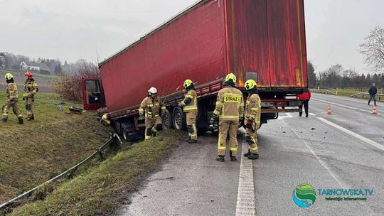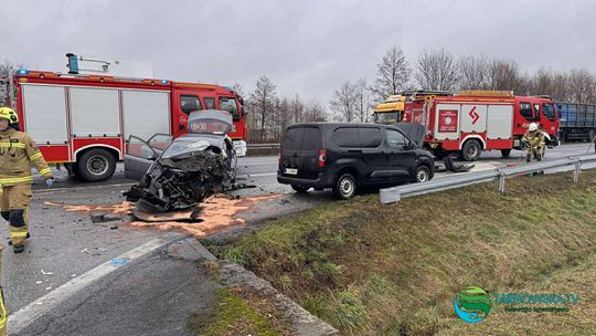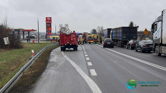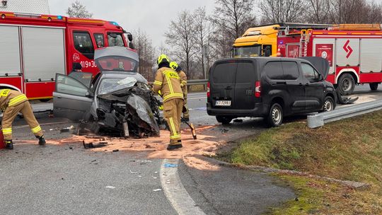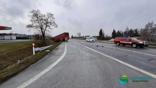 Na miejscu osiem zastępów straży pożarnej, strażacy zabezpieczyli miejsce zdarzenia, konieczne było użycie sprzętu hydraulicznego celem wyciągnięcia jednej osoby zakleszczonej w samochodzie. Strażacy neutralizują wycieki z pojazdów oraz zabezpieczają wycieki paliwa ze zbiornika samochodu ciężarowego, który częściowo znajduje się w rowie.