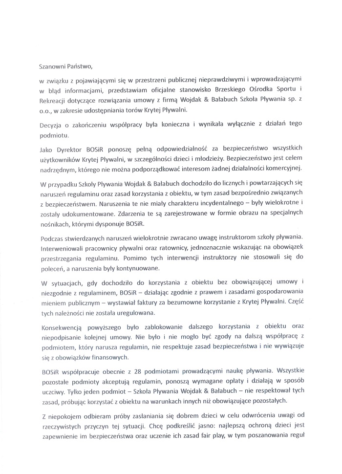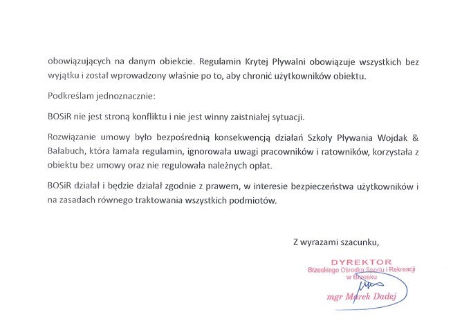 W dniu 10 grudnia 2025 r. otrzymałem z Brzeskiego Ośrodka Sportu i Rekreacji (BOSiR) pismo o natychmiastowym rozwiązaniu naszej umowy.