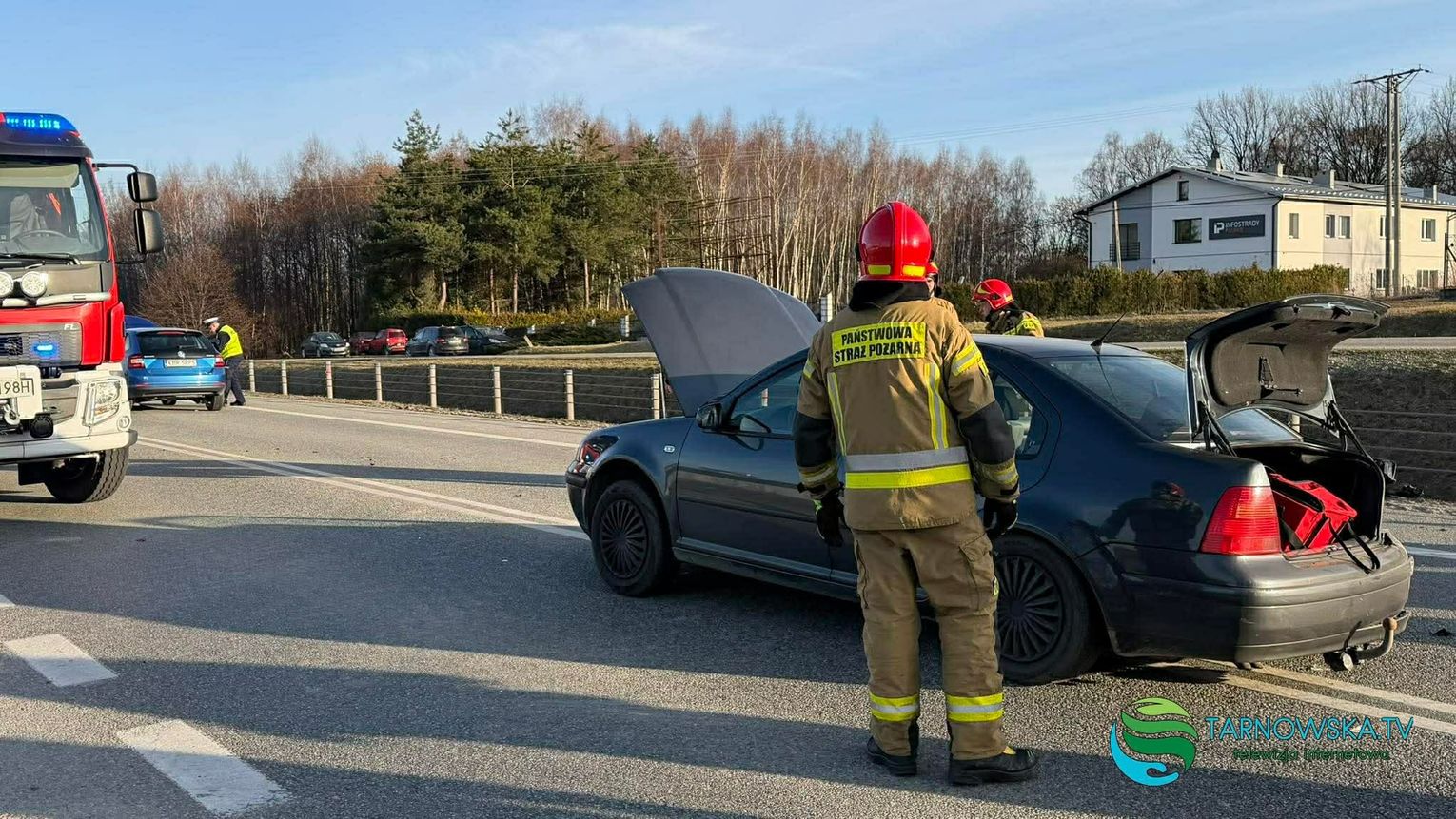Przez blisko godzinę ruch drogowy był zablokowany, obecnie wprowadzony został ruch wahadłowy, którym kierują strażacy. Policja wyjaśnia okoliczności zdarzenia.