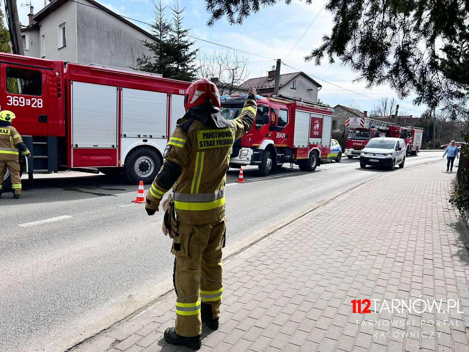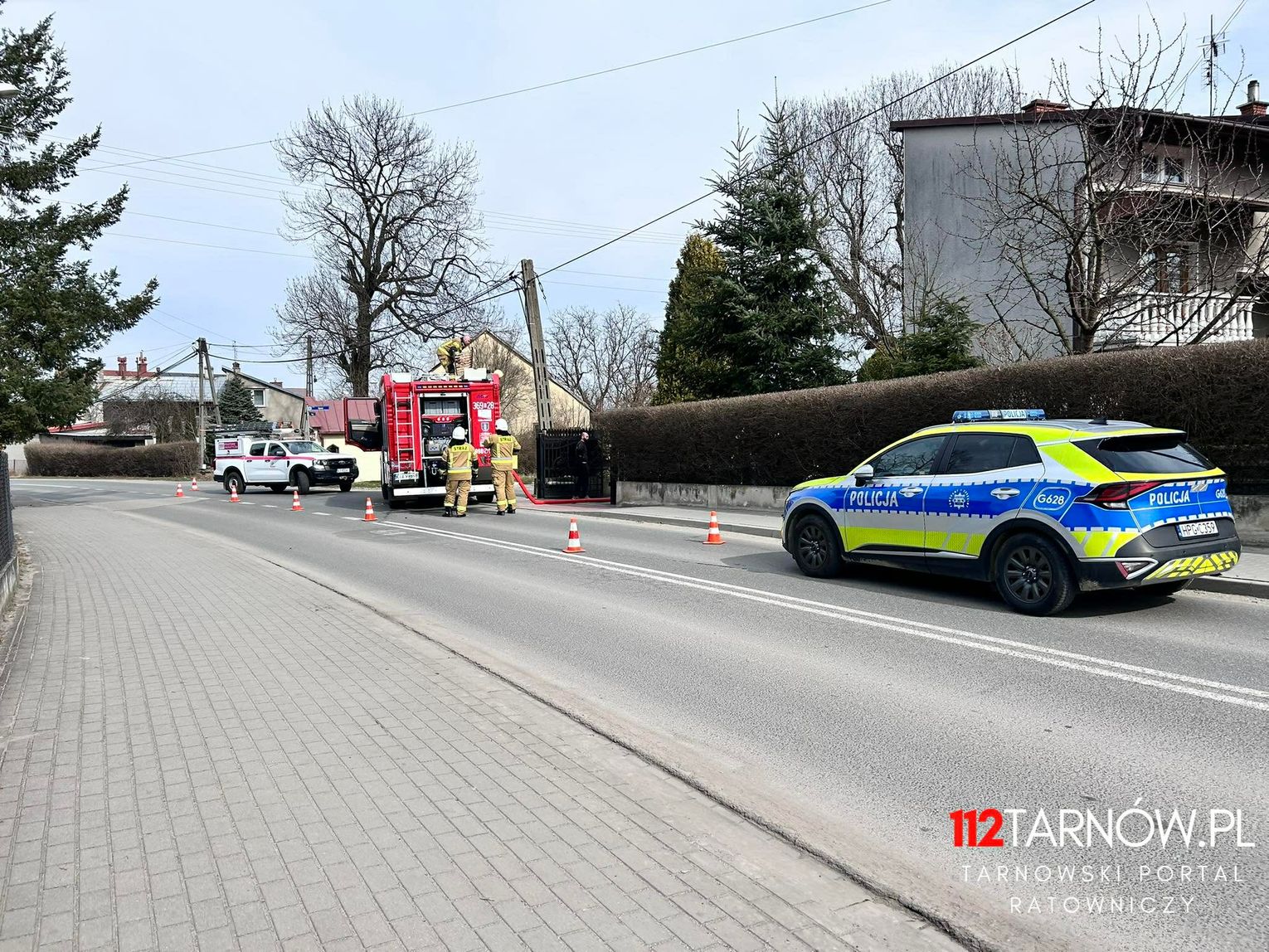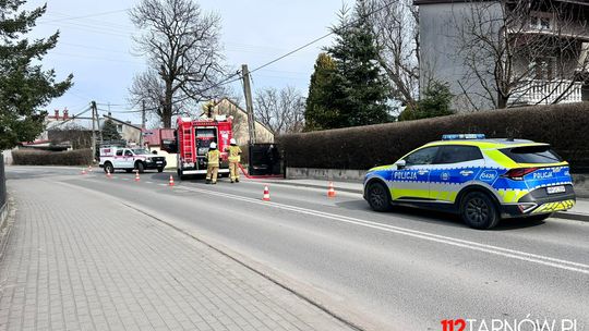 Na drodze w pobliżu domu objętego pożarem występują utrudnienia w ruchu drogowym, brak osób poszkodowanych. Na miejscu pogotowie energetyczne i policja.