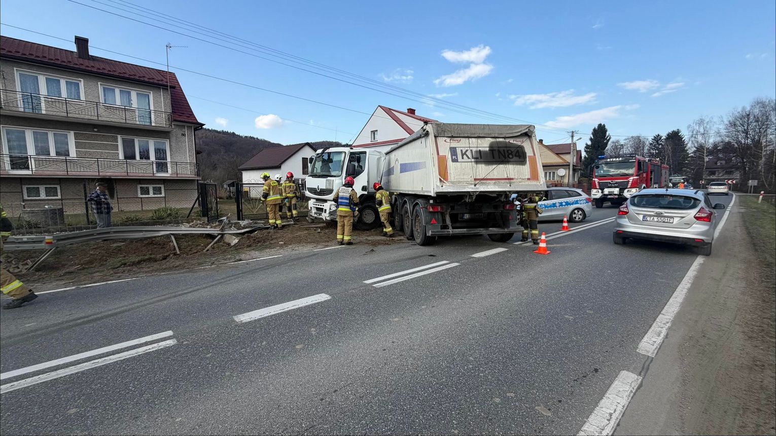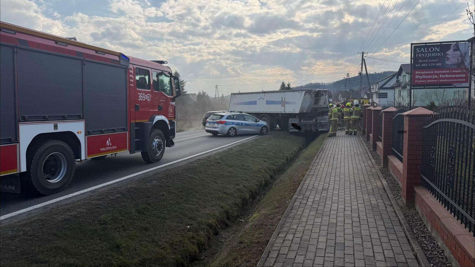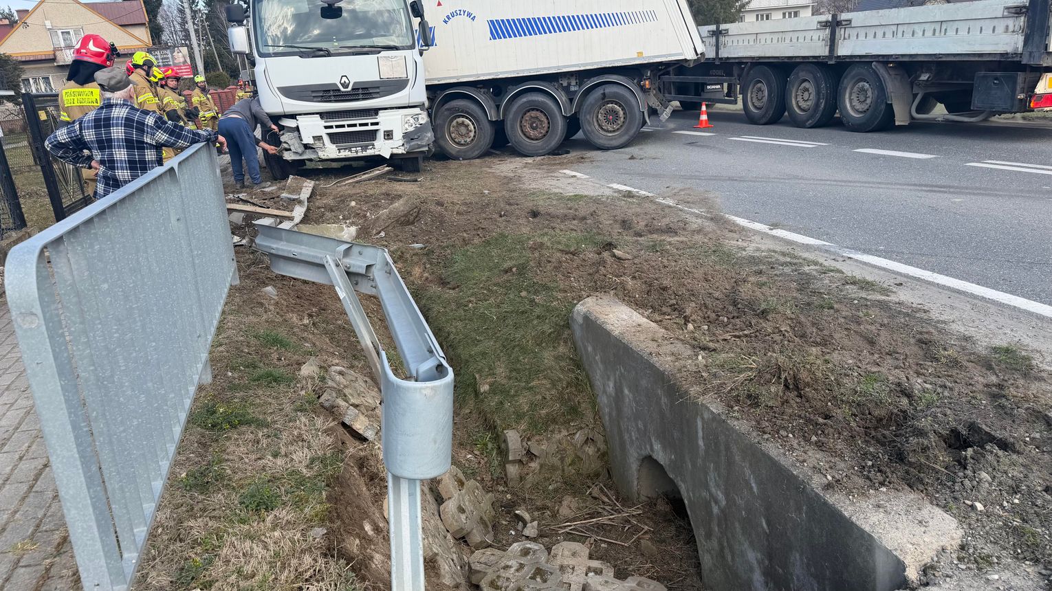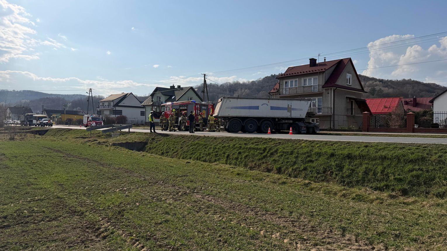 Służby otrzymały zgłoszenie we czwartek 12 marca po godzinie 13:00 o zdarzeniu drogowym w miejscowości Sukmanie, na drodze wojewódzkiej 975 z udziałem samochodu ciężarowego wraz z naczepą. Na miejsce zadysponowano zastępy straży pożarnej, pogotowie ratunkowe i policję.