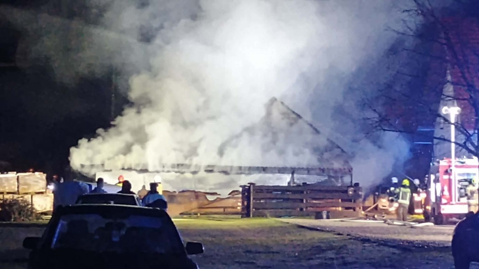 Służby zostały zaalarmowane około godziny dwudziestej, że na terenie Zajazdu Folwark w miejscowości Grzybów doszło do pożaru budynku gospodarczego i blaszanej wiaty, na miejsce zadysponowano liczne zastępy straży pożarnej i policję.