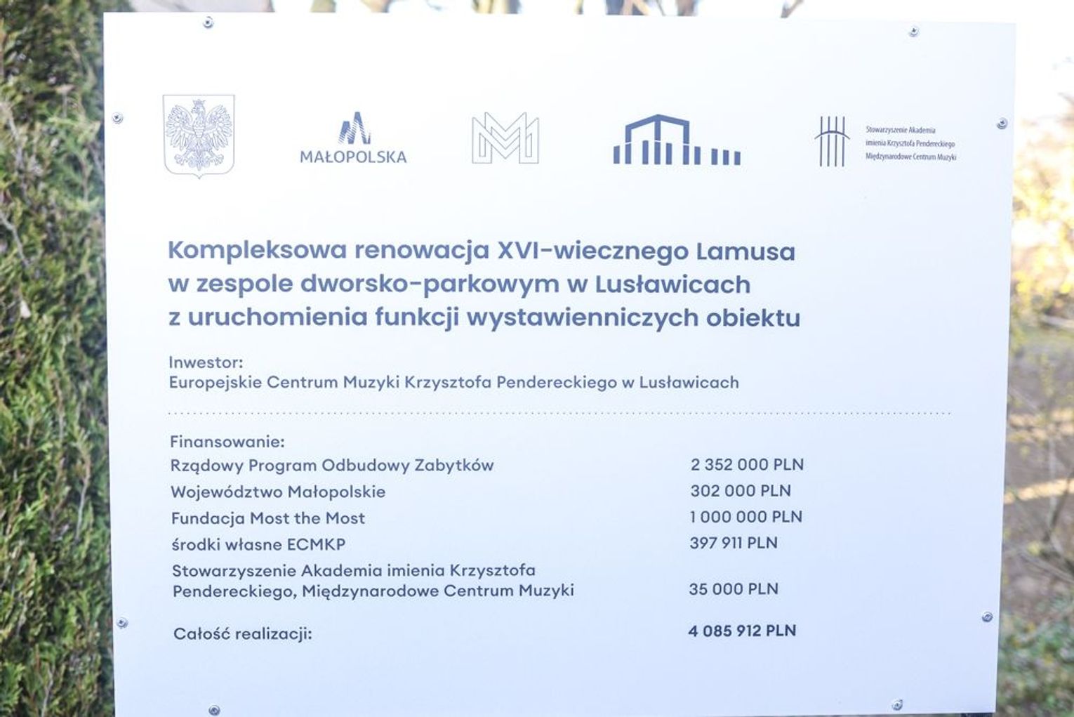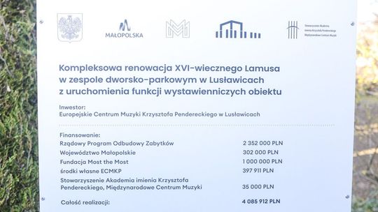 Remont Lamusa stanowił realizację zadania: „Kompleksowa renowacja XVI-wiecznego Lamusa w zespole dworsko-parkowym w Lusławicach z uruchomieniem funkcji wystawienniczych obiektu”. Lusławicki Lamus zwyciężył w Konkursie „Nasz Zabytek” Fundacji Most the Most. Finansowanie: Rządowy Program Odbudowy Zabytków, Województwo Małopolskie, Fundacja Most the Most, środki własne ECM KP, Stowarzyszenie Akademia imienia Krzysztofa Pendereckiego, Międzynarodowe Centrum Muzyki. Więcej informacji na stronie internetowej ECM KP.