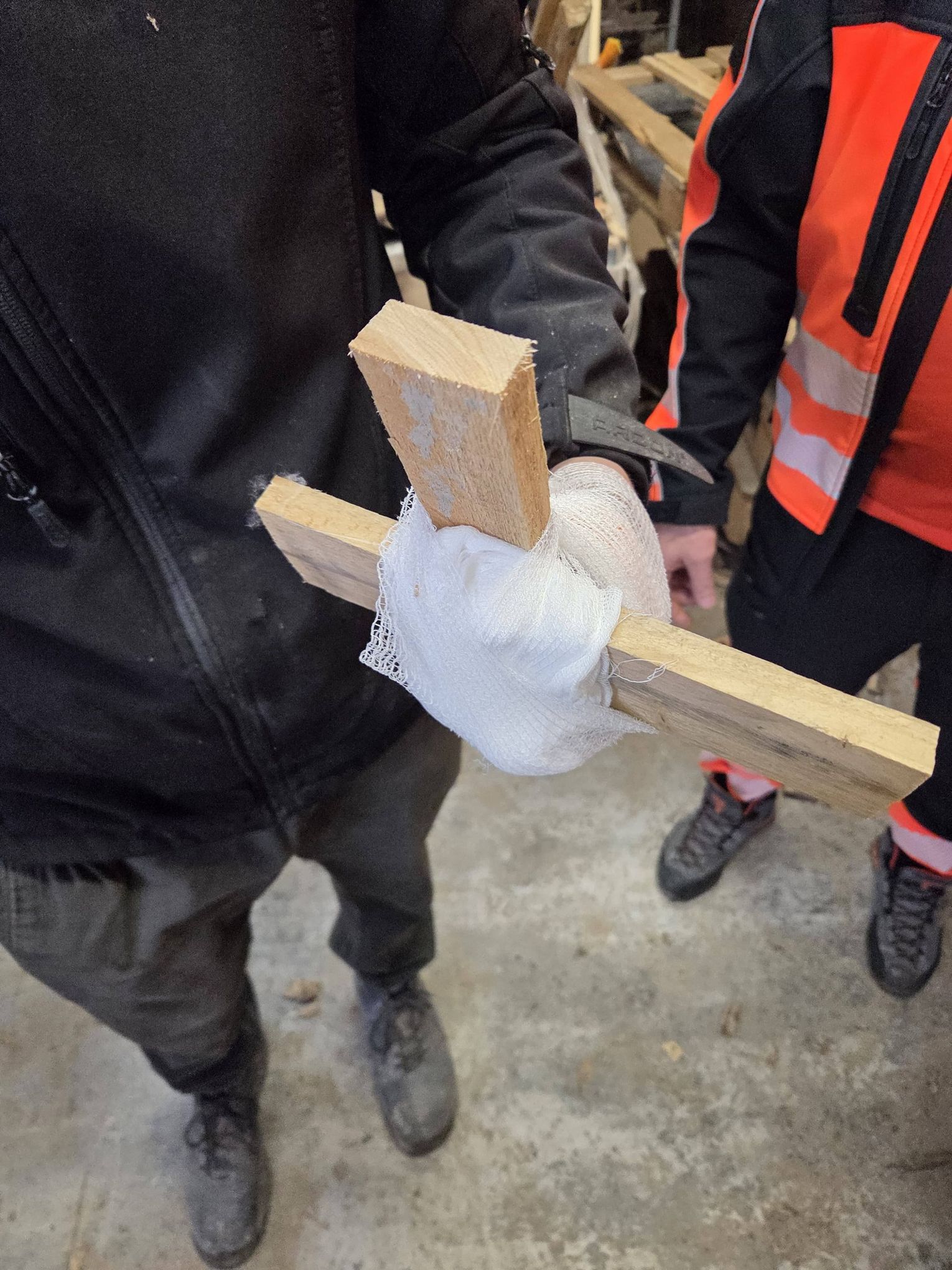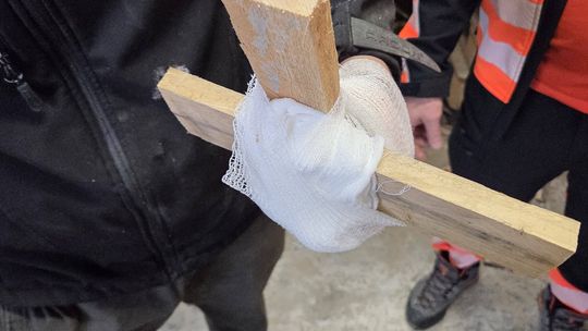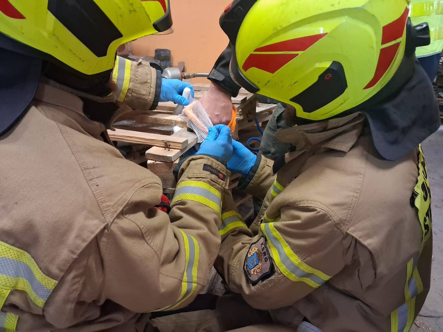 Aby bezpiecznie uwolnić pracownika, ratownicy podjęli decyzję o wycięciu fragmentu drewnianej palety razem z przybitą dłonią. Taki sposób działania pozwolił ograniczyć dodatkowe uszkodzenia tkanek i przygotować poszkodowanego do transportu medycznego.