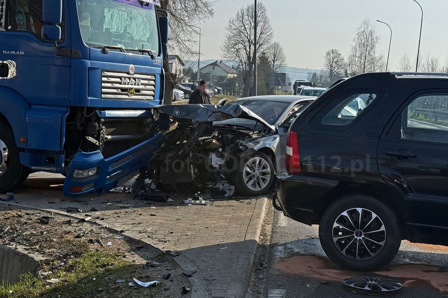 Do groźnego wypadku doszło w środę, 25 marca, kilkanaście minut przed godziną 7:00 na drodze wojewódzkiej nr 979 w Moszczenicy (ul. Cesarska). W zdarzeniu uczestniczyły dwa samochody osobowe oraz samochód ciężarowy. Do kolizji doszło na wyjeździe z parkingu przy sklepach Biedronka i Delikatesy Centrum, w rejonie ronda.