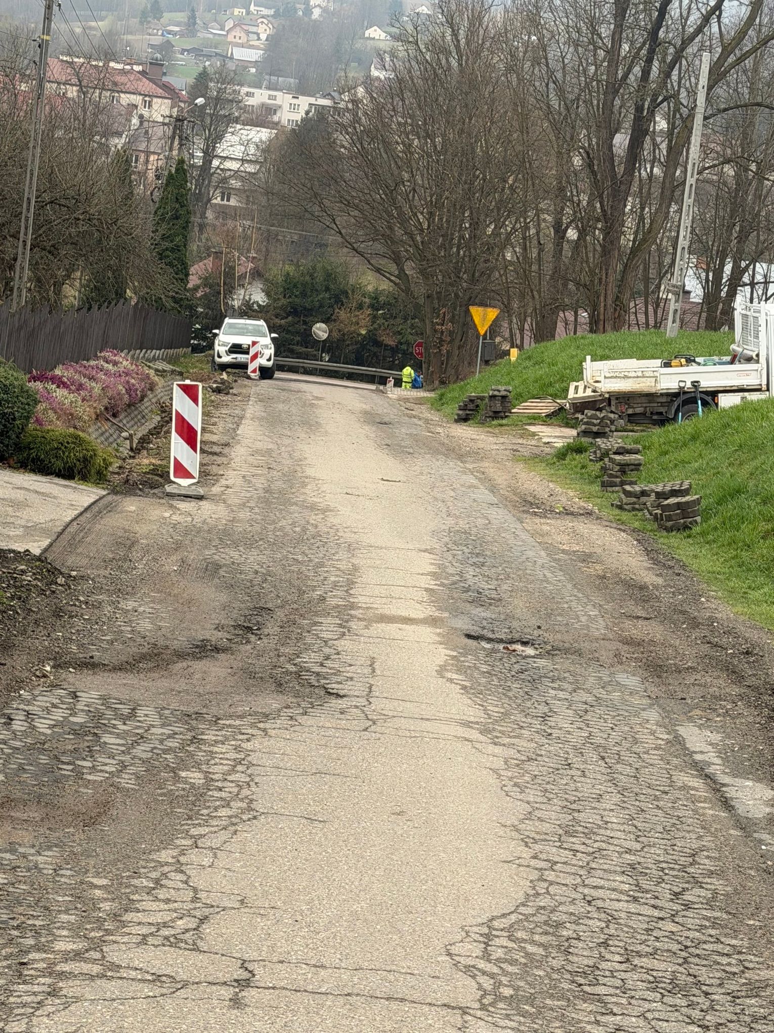 Obecnie trwają prace przygotowawcze i rozbiórkowe. W pierwszym etapie usuwane są dotychczasowe elementy infrastruktury drogowej, w tym zużyta nawierzchnia oraz krawężniki. To niezbędny krok przed rozpoczęciem zasadniczych robót budowlanych.
