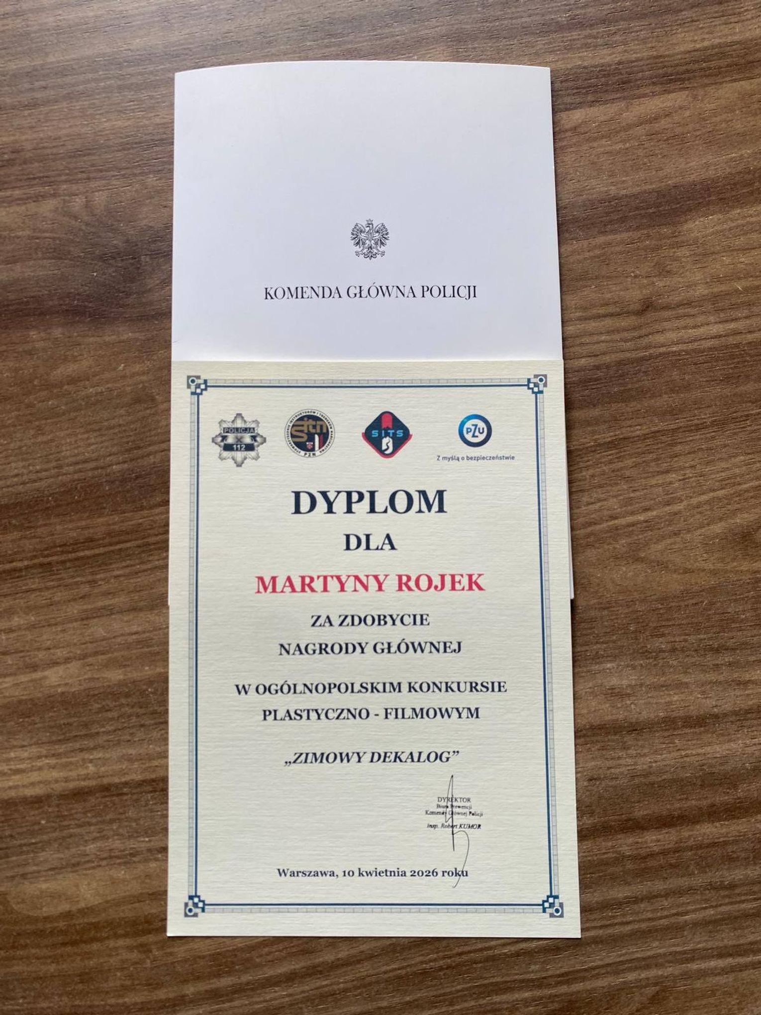 29 kwietnia 2026 roku w Komendzie Miejskiej Policji w Tarnowie odbyło się spotkanie, podczas którego uhonorowano laureatkę ogólnopolskiego konkursu plastyczno-filmowego pt. ,,Zimowy dekalog", promującego zasady bezpieczeństwa w okresie zimowym.