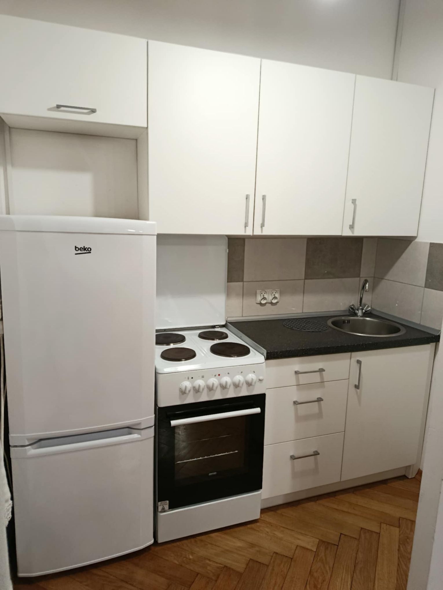 Kuchnia w całości wyposażona w meble, lodówkę, kuchenkę elektryczną.