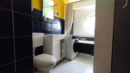 ✅ Duża łazienka z oknem wyposażona w umywalkę z szafką, wannę, nowoczesną pralkę.