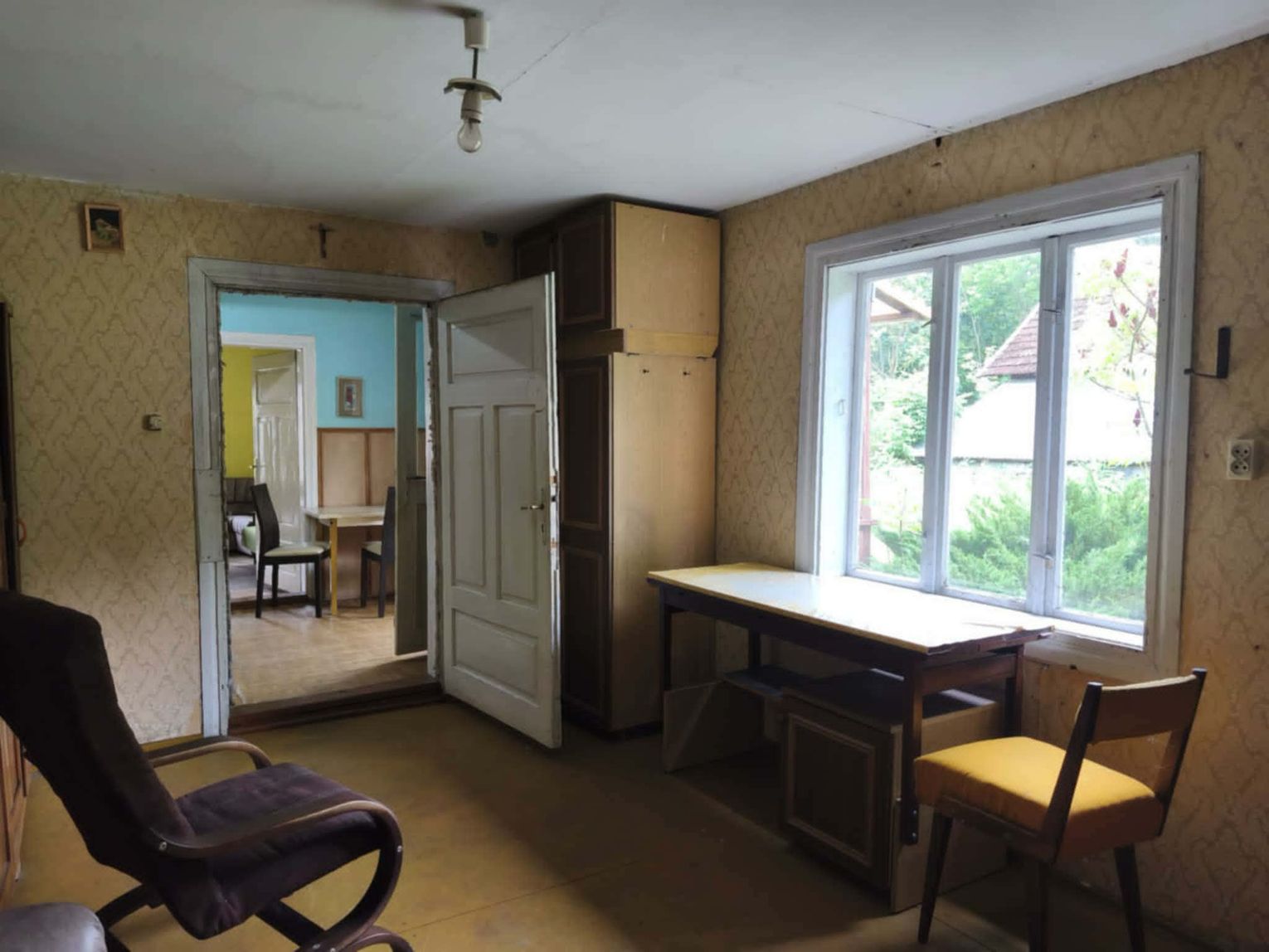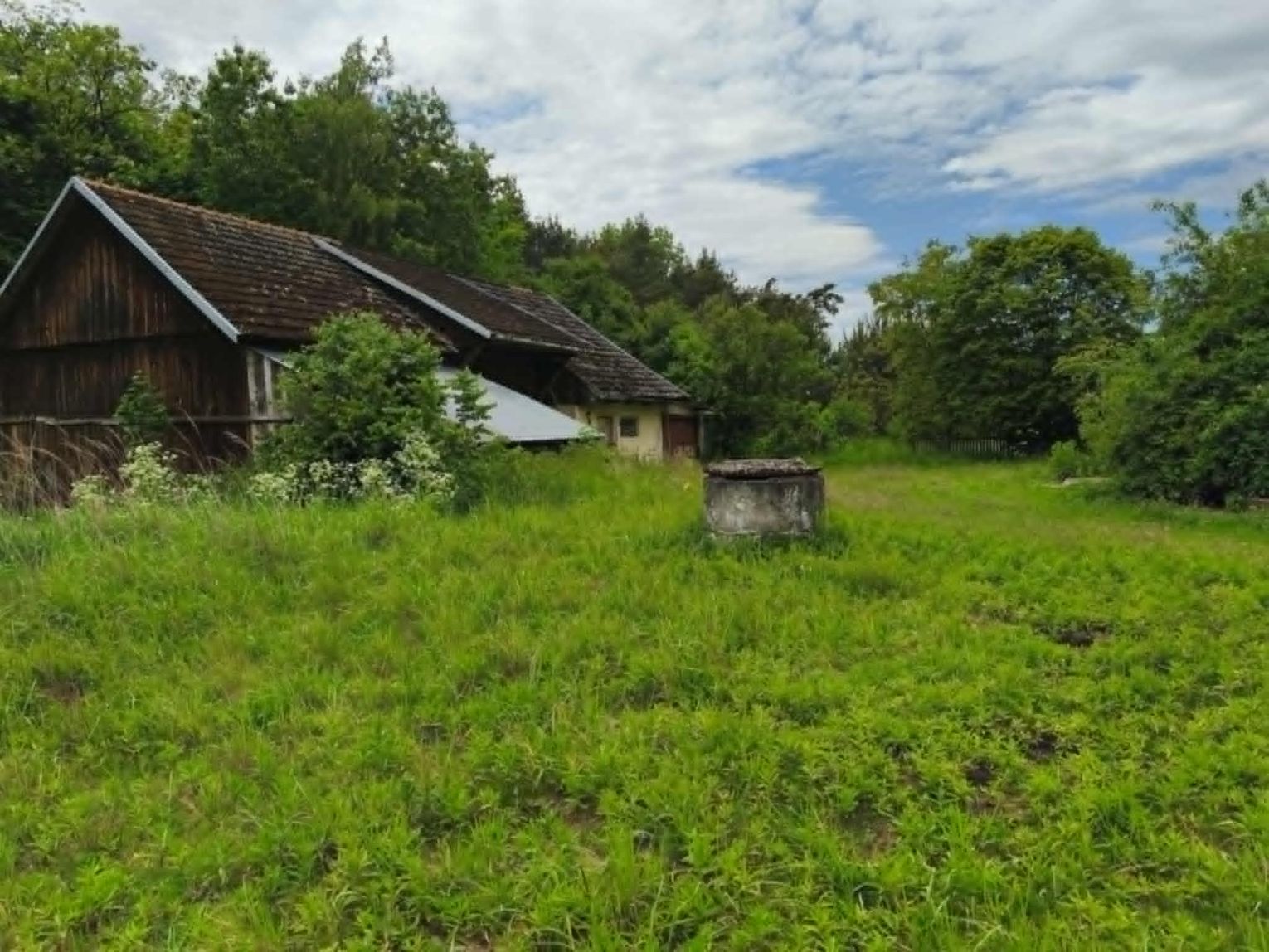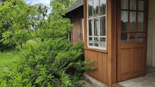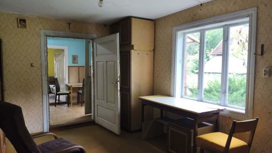 Opis nieruchomości: Dom parterowy, wybudowany w latach 60-tych, częściowo murowany (od strony drogi), częściowo drewniany, pokryty dachówką cementową, oraz wyposażony w drewniane okna. W środku znajduję się: