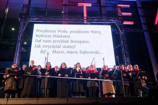 Wieczorne śpiewanie dla Niepodległej przed teatrem Solskiego [zdjęcia]