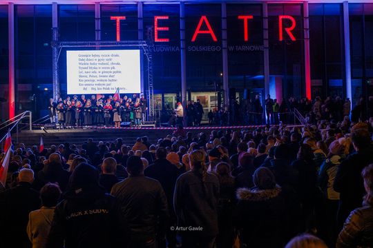 Wieczorne śpiewanie dla Niepodległej przed teatrem Solskiego [zdjęcia]