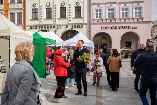 Prezydent Kwaśny i poseł Górnikiewicz rozdawali tulipany na tarnowskim rynku [zdjęcia]