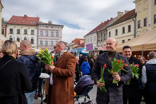 Prezydent Kwaśny i poseł Górnikiewicz rozdawali tulipany na tarnowskim rynku [zdjęcia]