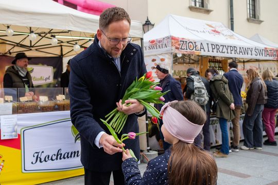 Prezydent Kwaśny i poseł Górnikiewicz rozdawali tulipany na tarnowskim rynku [zdjęcia]