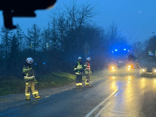 Rozległa plama oleju na drogach regionu tarnowskiego. Wielogodzinna akcja służb i kolizja z udziałem wozu strażackiego