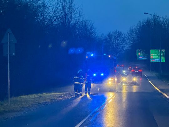 Rozległa plama oleju na drogach regionu tarnowskiego. Wielogodzinna akcja służb i kolizja z udziałem wozu strażackiego