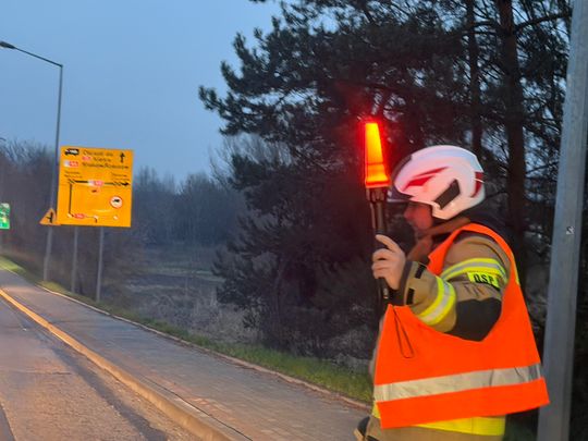 Rozległa plama oleju na drogach regionu tarnowskiego. Wielogodzinna akcja służb i kolizja z udziałem wozu strażackiego