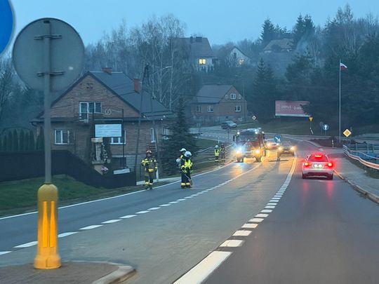 Rozległa plama oleju na drogach regionu tarnowskiego. Wielogodzinna akcja służb i kolizja z udziałem wozu strażackiego