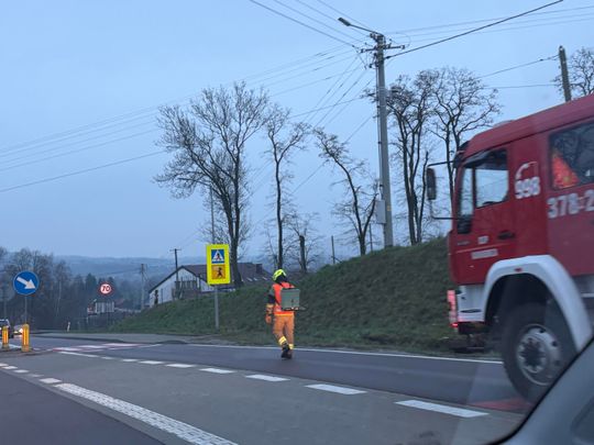 Rozległa plama oleju na drogach regionu tarnowskiego. Wielogodzinna akcja służb i kolizja z udziałem wozu strażackiego