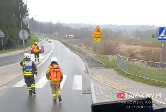 Rozległa plama oleju na drogach regionu tarnowskiego. Wielogodzinna akcja służb i kolizja z udziałem wozu strażackiego